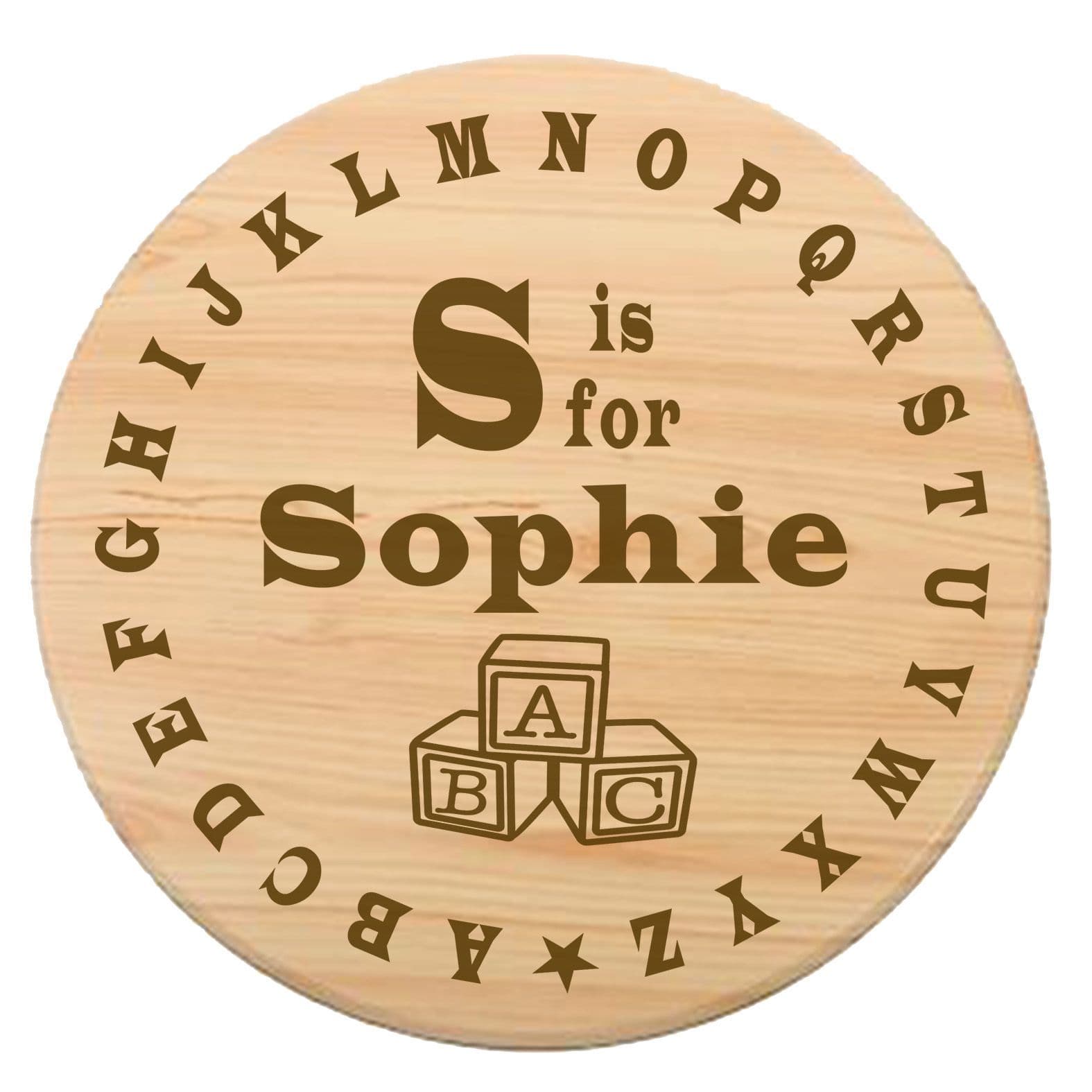 Our solid wood stool is engraved with our alphabet design featuring an alphabet boarder, Name and Letter and ABC building block motif.